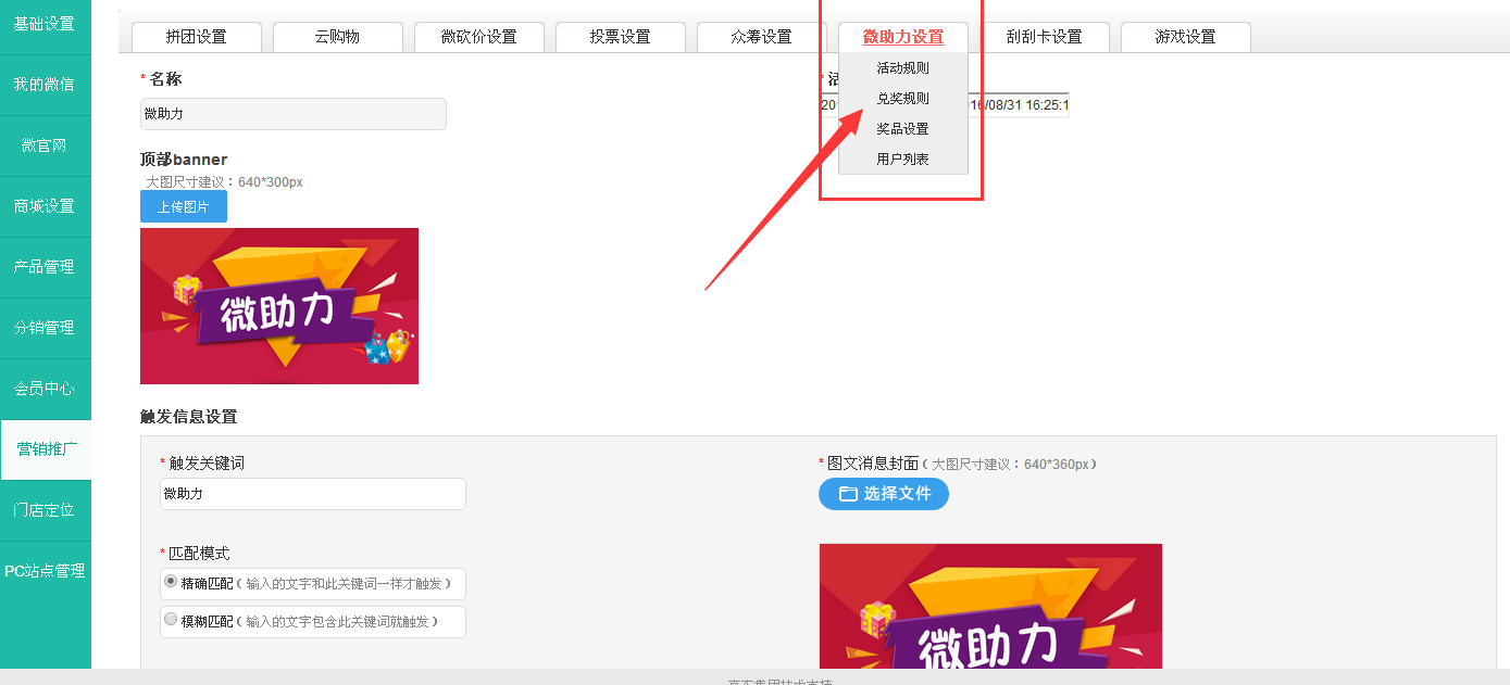 分销系统后台微助力选项位于系统后台首页左侧菜单栏,点击微助力,即可展示微助力主要设置。微助力选项分为基本设置、活动规则、兑奖规则、奖品设置、用户列表。