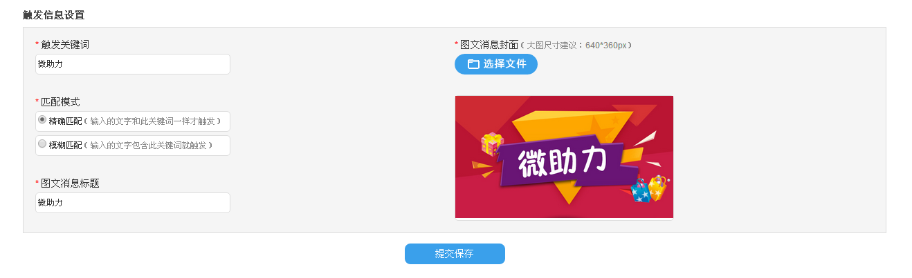 (3)图文消息标题:触发关键词后,系统将弹出图文消息,图文消息的标题自定义。