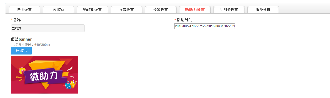 2.上传图片:图片应与用户组织活动内容及名称相关,建议美工设计640*300px的活动图片。