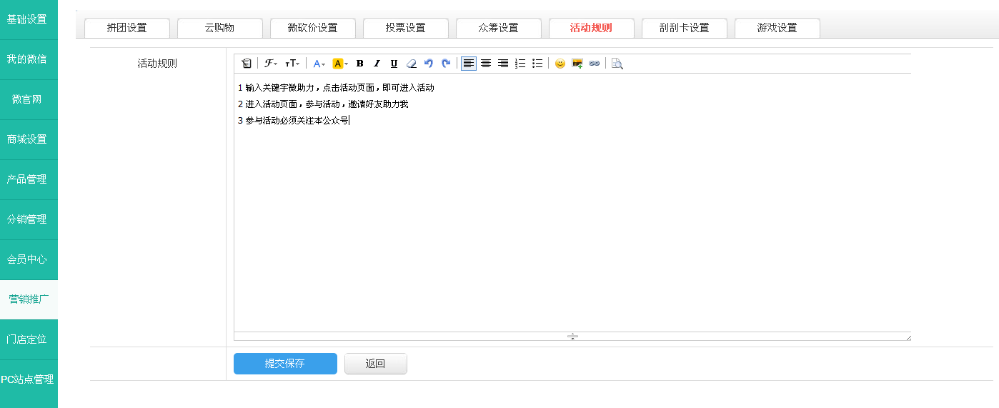 活动规则页面提供基本编辑功能,系统用户可使用其他编辑器编辑好具体内容后,粘贴入编辑文本框。内容提交保存以后,活动前台显示在助力规则页面。PS:文本框插入图片或表情更加美观哦!