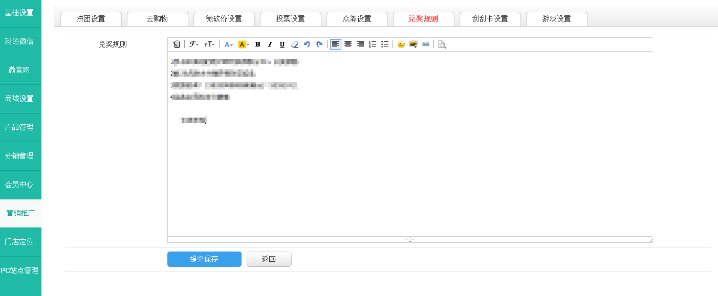 兑奖规则页面提供基本编辑功能,系统用户可使用其他编辑器编辑好具体内容后,粘贴入编辑文本框。内容提交保存以后,活动前台显示在助力规则页面。