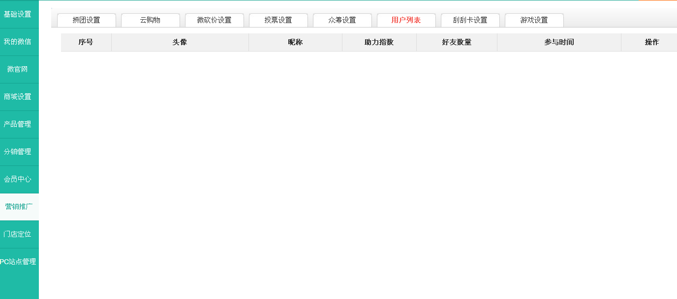 用户列表可显示活动参与者的基本信息,信息包括序号、头像、昵称、助力指数、好友数量、参与时间,系统用户也可以通过“操作”选项实现对用户的基本操作(删除)