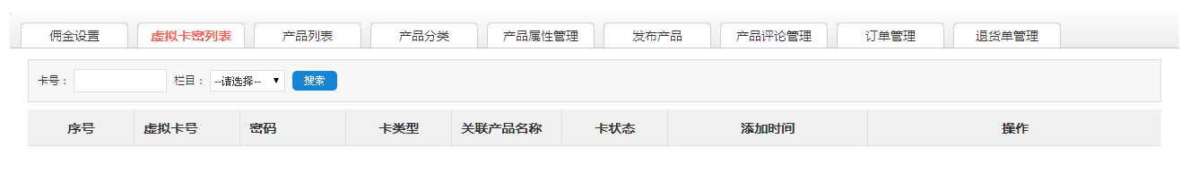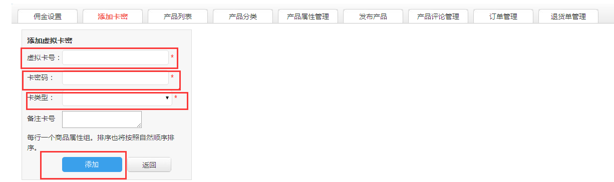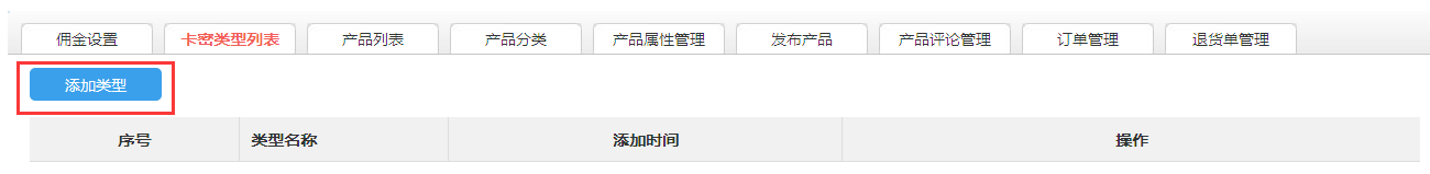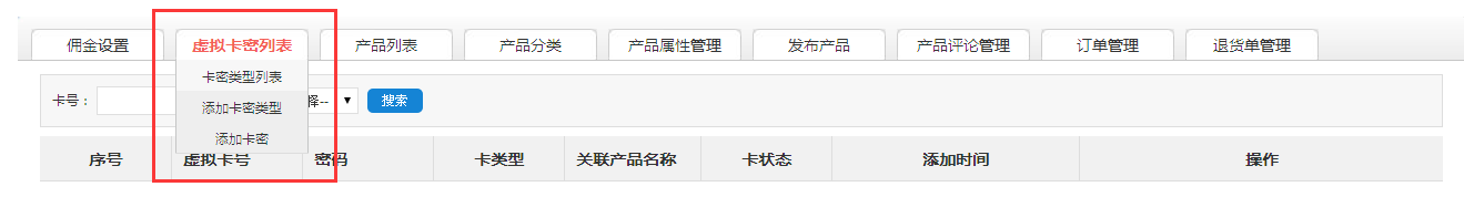虚拟卡密列表分为:1.卡密类型列表、2.添加卡密类型、3.添加卡密