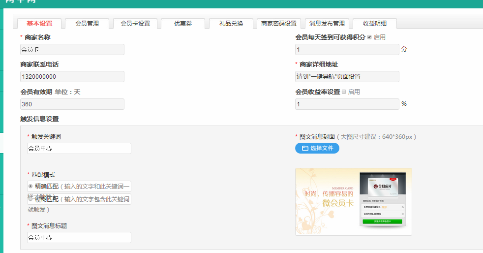 2.触发信息设置,触发关键词指的是在微商城中输入会员中心之后可以出现的图文消息里面有会员中心的基本信息。
