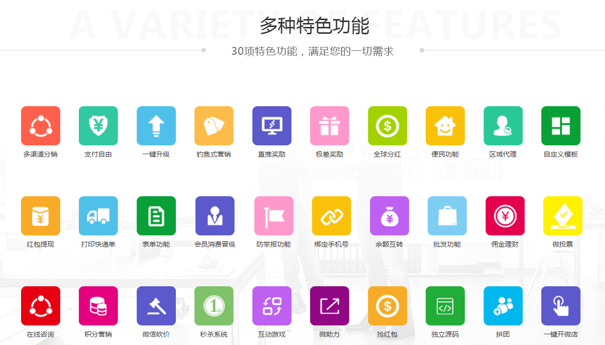 实现由商家平台统一管理,如财务系统、订单系统、会员管理、物流管理、分销功能、吸粉推广,运营促销等各类别一目了然。本公司独具有的员工管理功能,可以实现权限分配机制,不同员工不同的后台功能模块管理。