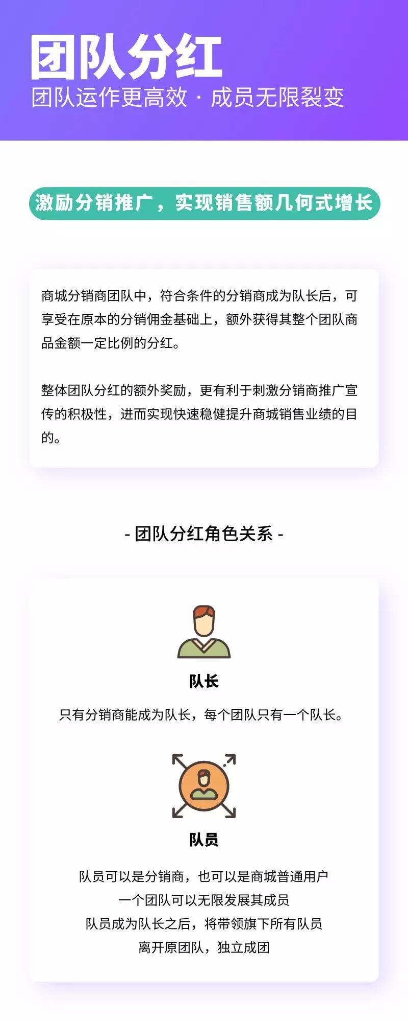 团队分红将火爆的分销结合,让商家能够可拓展合伙人,合伙人帮助商家卖货打开销路,真正的实现动动手指通过朋友圈就能实现裂变传播。