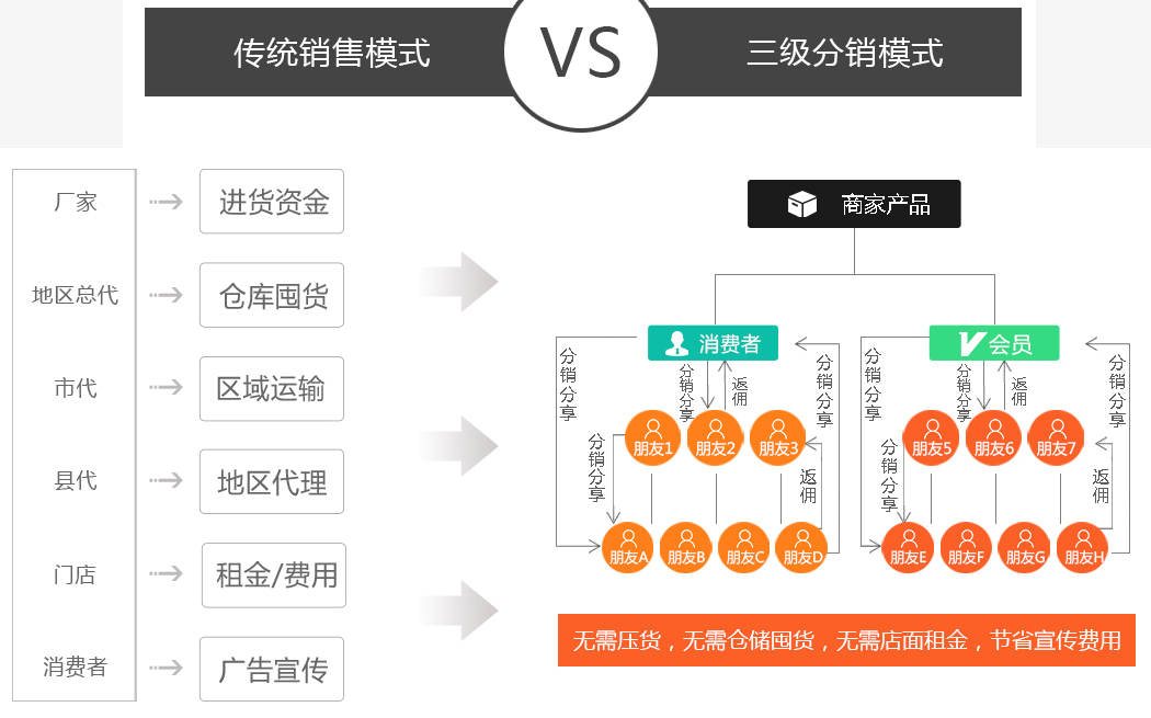 传统销售VS三级分销模式: