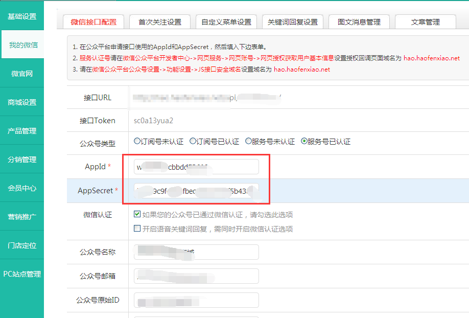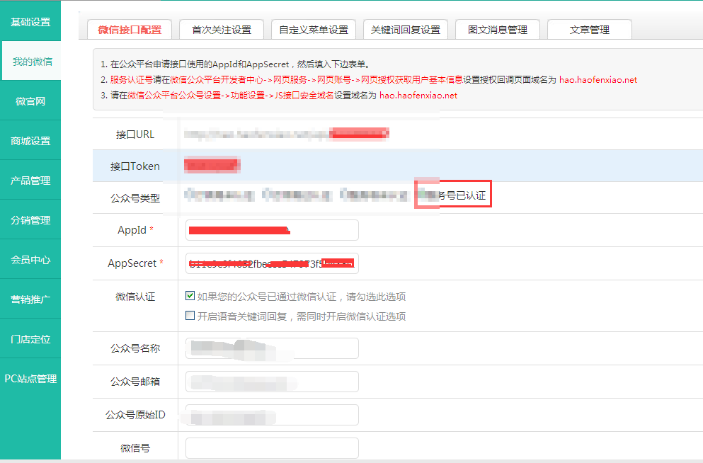 一、登陆用户后台,找到微信接口配置,填写基本信息