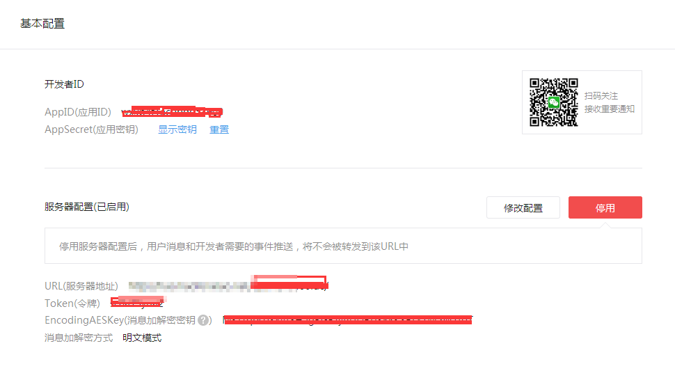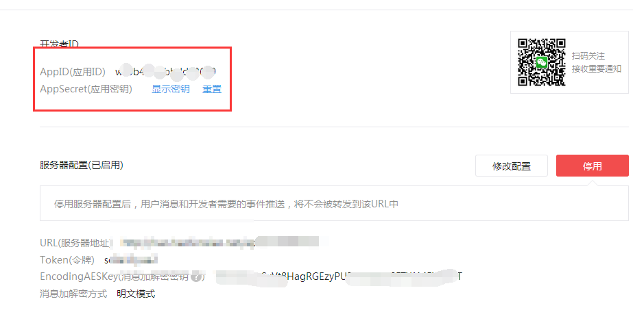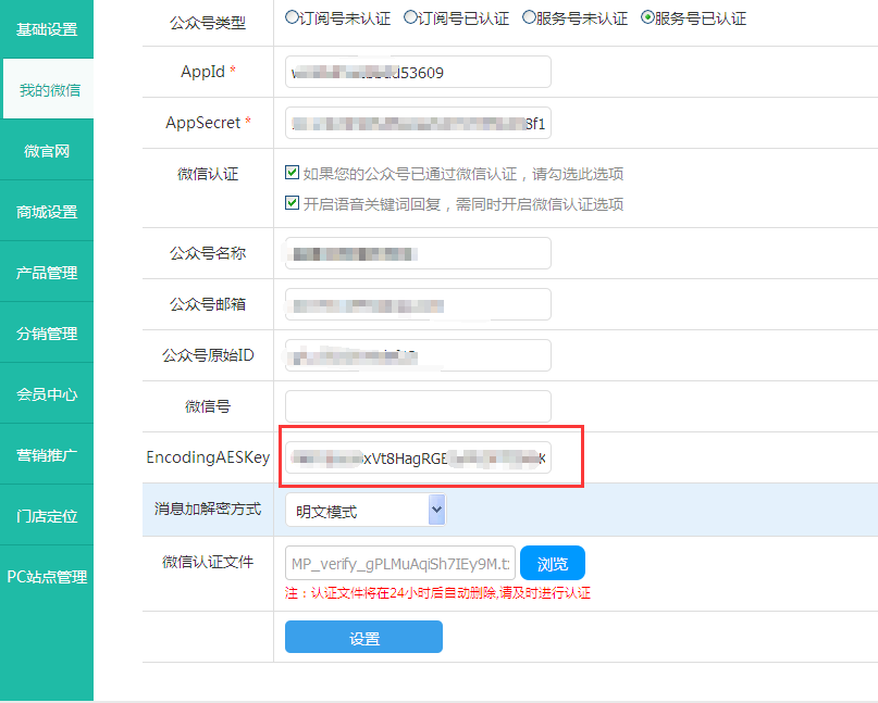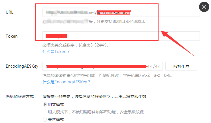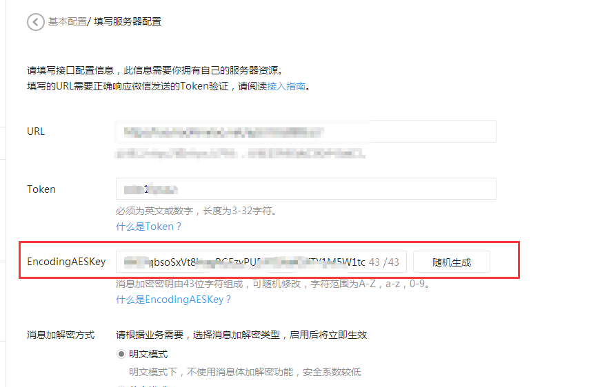 和微信上的EncodingAESKey和消息加密方式填写一致