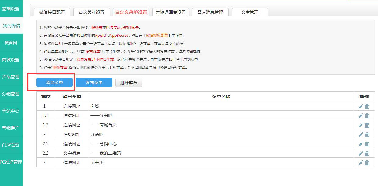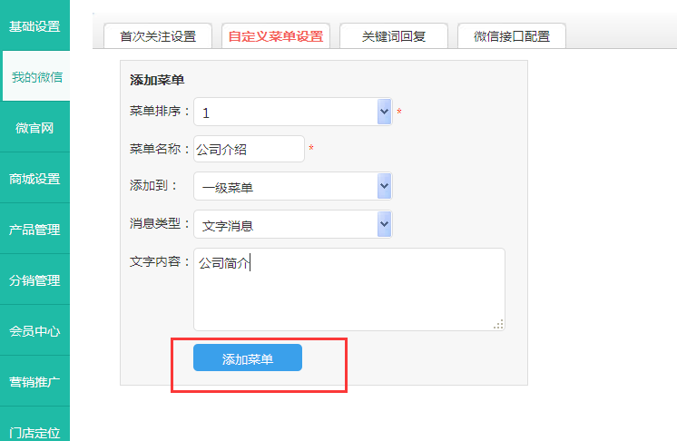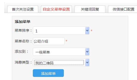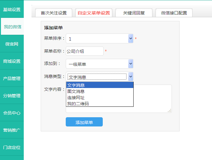 输入菜单名称,选择菜单级别,选择菜单消息类型