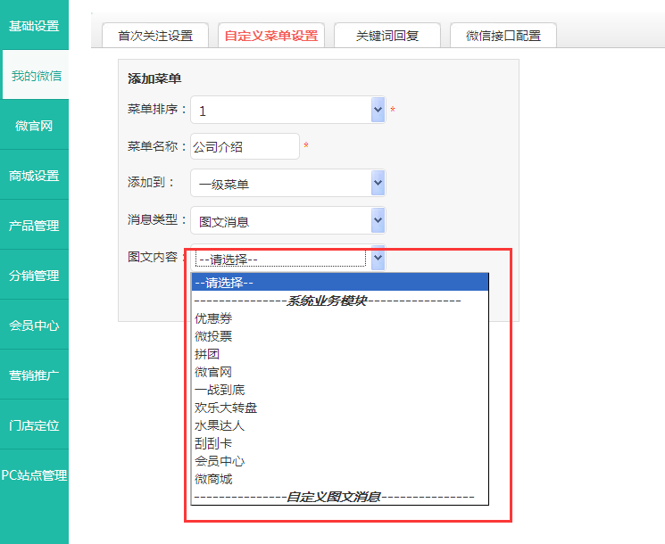如果您选择的是图文消息,需要选择图文内容,选择系统默认模块或者自定义图文消息,选择后添加菜单就可以