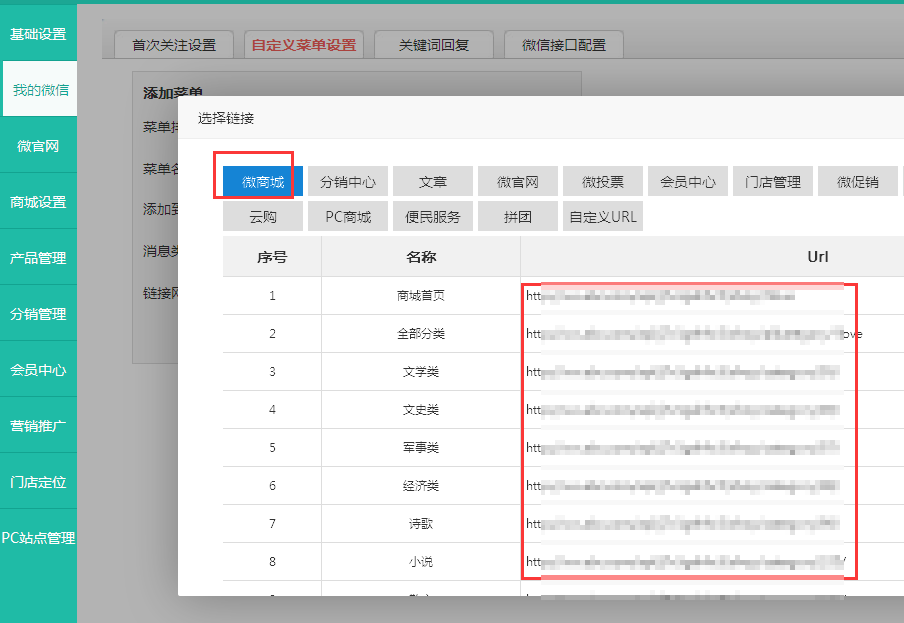 如果您选择的是连接网址,需要输入链接网址,可以点击后面的搜索,点击搜索后,会进入系统URL链接地址,选择相应的链接地址,添加菜单就可以了