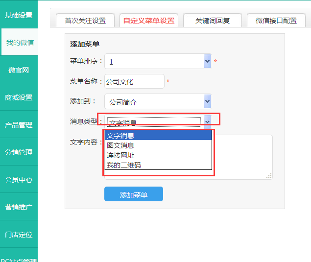 选择消息类型跟选择一级菜单的消息类型是一样的,选择相应的消息类型后,添加菜单就可以了。